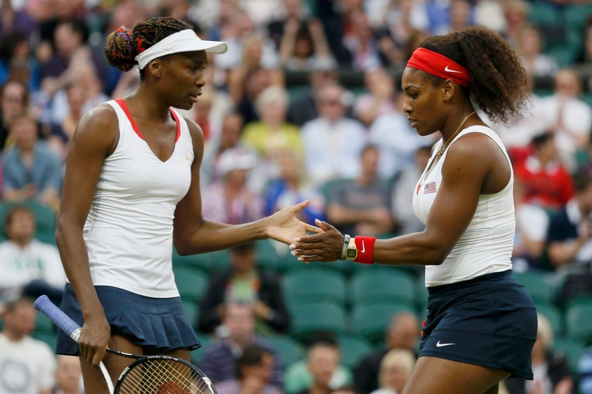 Serena Williams of the U.S. confers with her sister, Venus Williams (L), in the women’s doubles tennis gold medal match against Czech Republic’s Andrea Hlavackova and Lucie Hradecka at the London Olympic Games, August 5, 2012. REUTERS/Stefan Wermuth (BRITAIN – Tags: OLYMPICS SPORT TENNIS)